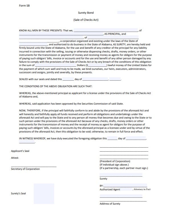 Alabama requires businesses to purchase the Sale of Checks Bond as part of the application process to obtain a Sale of Checks license. The bond ensures that the public will receive compensation for financial harm if the business fails to comply with the licensing regulations. In short, the bond is a type of insurance that protects the public if the business breaks licensing laws.