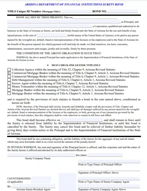 Arizona requires bankers to purchase the Commercial Mortgage Banker Bond as part of the application process to obtain a commercial mortgage banker license. The bond ensures that the public will receive compensation for financial harm if the banker fails to comply with the licensing regulations. In short, the bond is a type of insurance that protects the public if the banker breaks licensing laws.