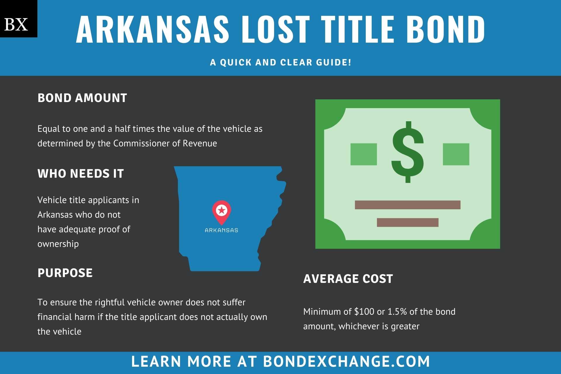 The Arkansas Lost Title Bond costs either $100 or 1.5% of the bond amount, whichever is greater (rates may vary for bonds greater than $25,000).