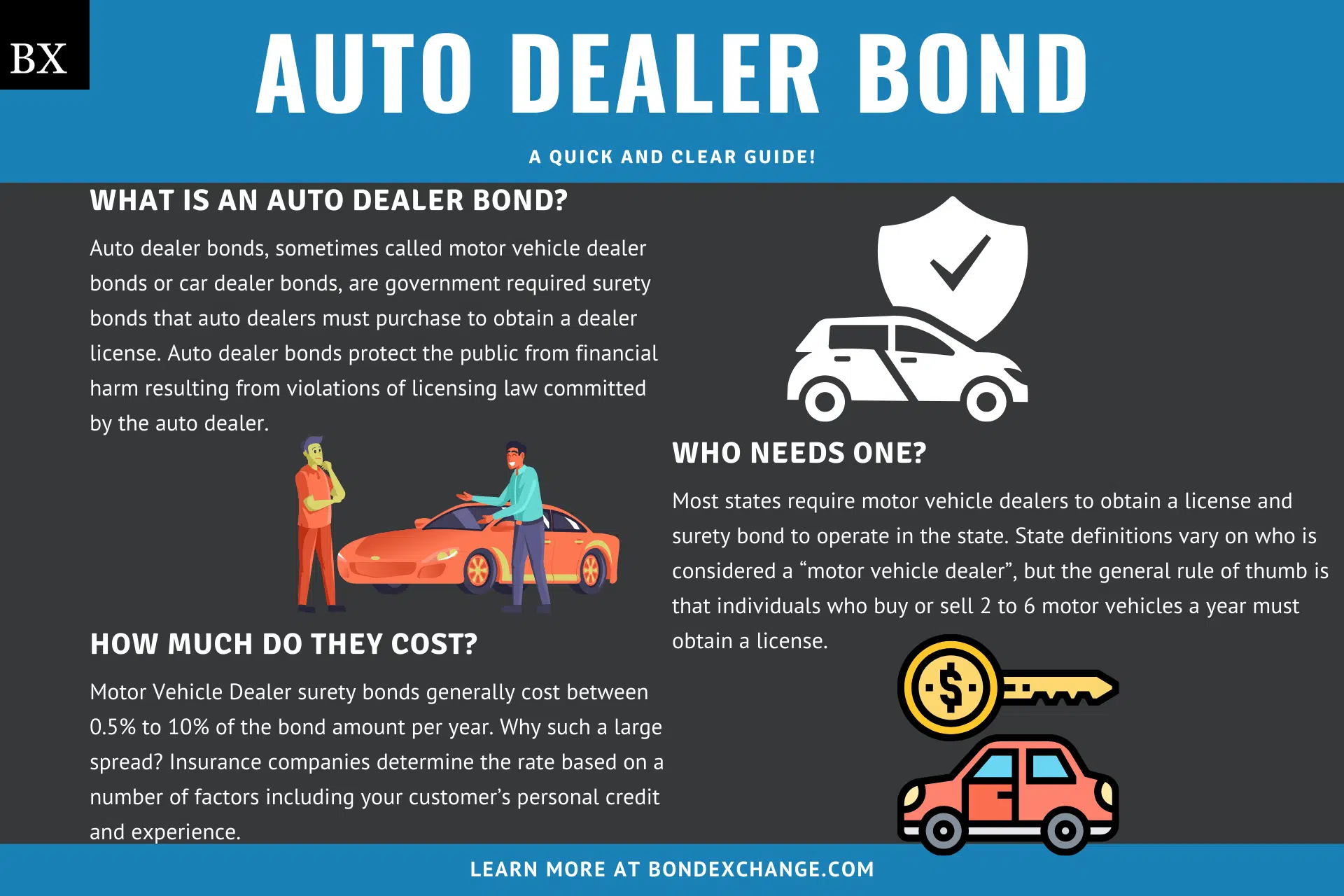 Dealers with the best credit and business experience can expect to pay the lowest rates, while dealers with poor credit will pay higher rates. The chart below offers a quick reference for the approximate bond cost on a $50,000 Auto Dealer bond
