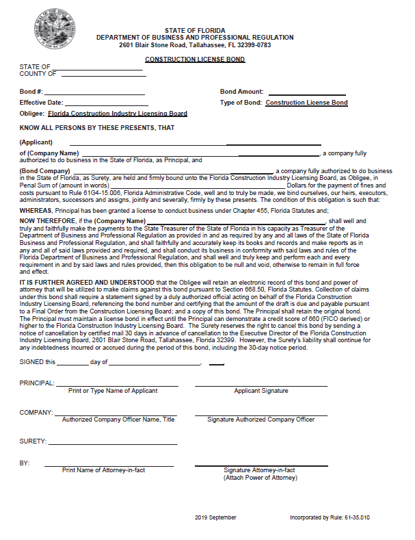 ***This page focuses exclusively on the Florida Construction Contractor License Bond. For more information on the Florida Financially Responsible Officer Bond and license requirements, view our Florida Financially Responsible Officer Bond Page.***