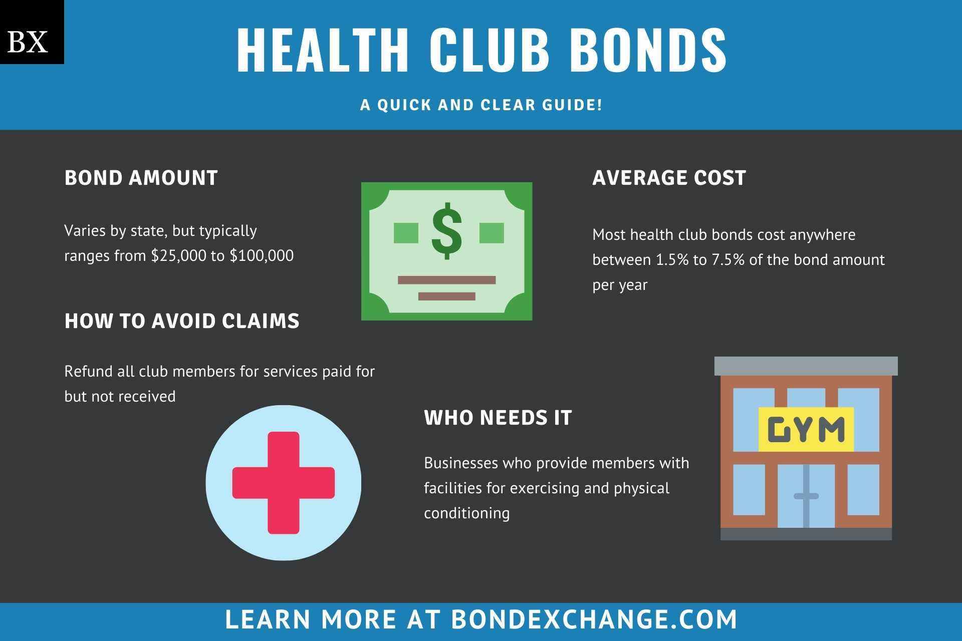 Health club owners with the best credit and business experience can expect to pay the lowest rates, while owners with poor credit will pay higher rates. BondExchange also offers monthly pay-as-you-go options for these bonds. The chart below offers a quick reference for the approximate bond cost on a $25,000 Health Club bond
