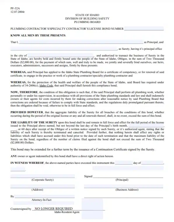 Idaho requires contractors to purchase the Plumbing Contractor / Specialty Contractor License Bond as part of the application process for the License. The bond ensures that the public will receive compensation for financial harm if the contractor fails to comply with the licensing regulations. In short, the bond is a type of insurance that protects the public if the contractor breaks licensing laws.