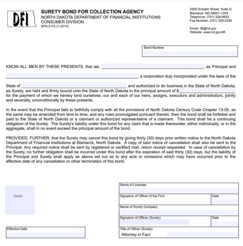 North Dakota statute 13-05-02 requires all collection agencies operating in the state to obtain a license with the Department of Financial Institutions. The North Dakota legislature enacted the licensing laws and regulations to ensure that collection agencies engage in ethical business practices. In order to provide financial security for the enforcement of the licensing law, collection agencies must purchase and maintain a $10,000 surety bond to be eligible for licensure.