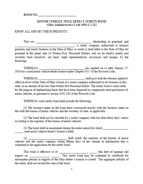 The State of Ohio does not require dealers to maintain any form of liability insurance. However, dealers must file a $25,000 motor vehicle title defect bond.