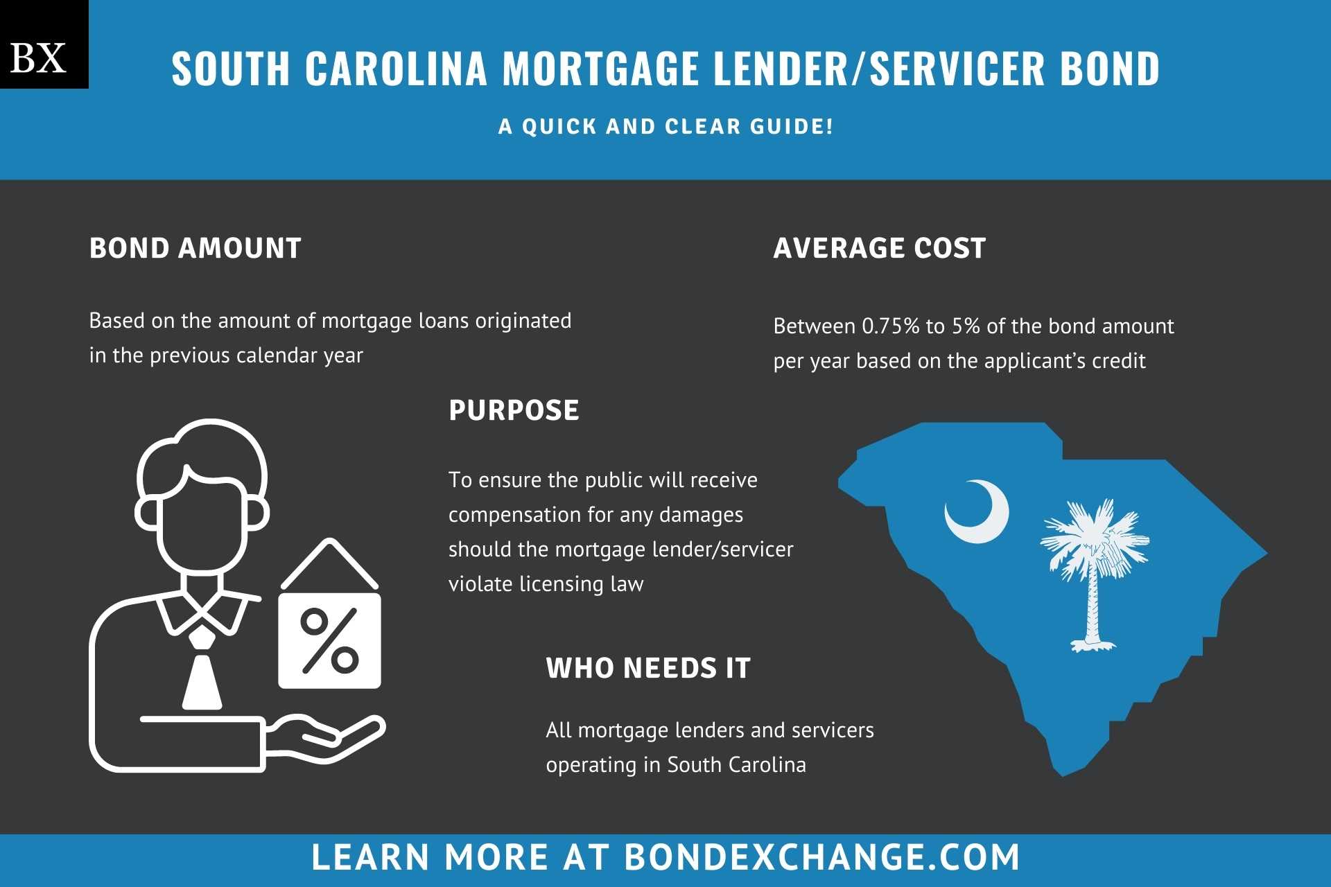 The South Carolina Mortgage Lender/Servicer Bond can cost anywhere between 0.75% to 5% of the bond amount per year. Insurance companies determine the rate based on a number of factors including your customer’s credit score and experience. The chart below offers a quick reference for the approximate bond cost on a $50,000 bond requirement.