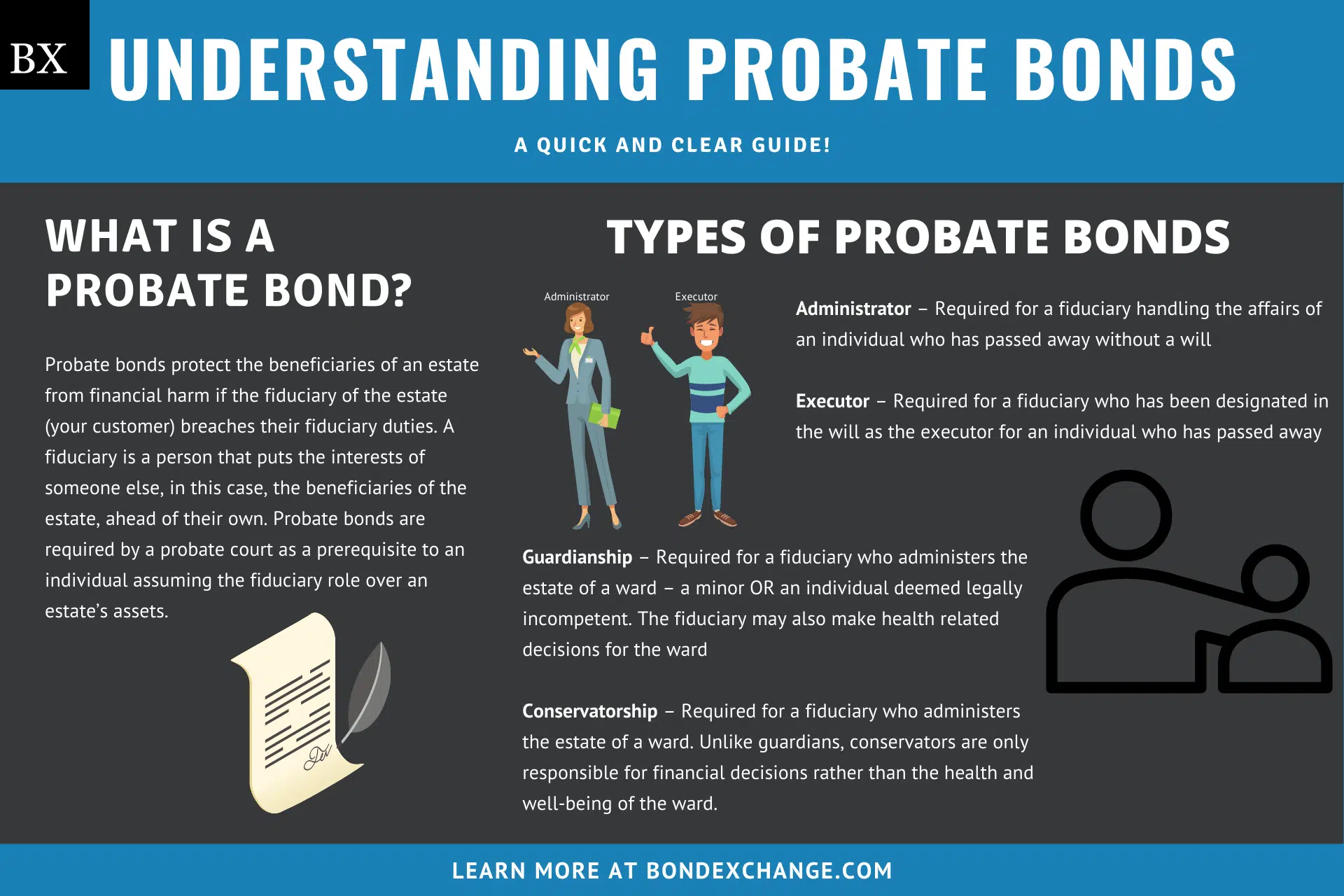 A Probate bond protects the beneficiaries of an estate from financial harm if the fiduciary of the estate (your customer) breaches their fiduciary duties. A fiduciary is a person that puts the interests of someone else, in this case, the beneficiaries of the estate, ahead of their own. Probate bonds are required by a probate court as a prerequisite to an individual assuming the fiduciary role over an estate’s assets.